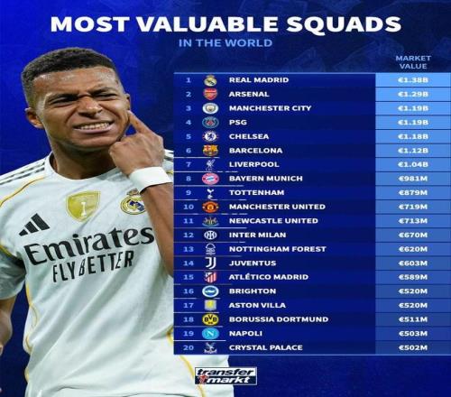 全世界总身价最高球队Top20: