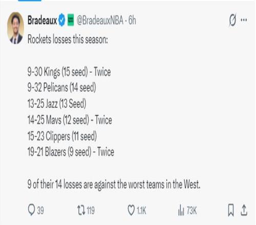 火箭接连输给西部15的国王两次,输给西部第12的独行侠两次,输给西部第九的开拓者两次,还输给西部14的鹈鹕、西部13的爵士,西部11的快船,火箭队14场失利有9场是输给弱旅。