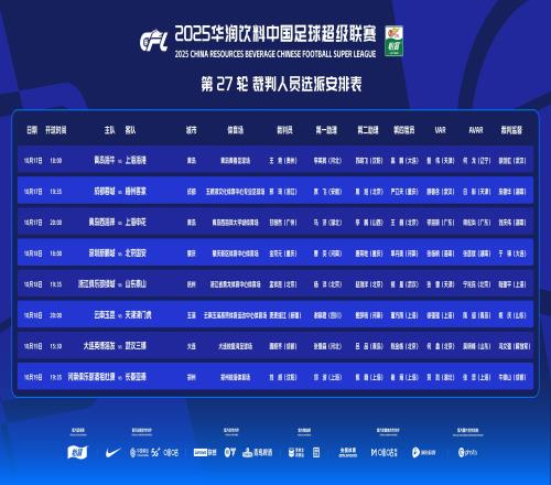 中超第27轮裁判选派:王竞执法海牛vs海港,邢琦吹成都vs梅州 -